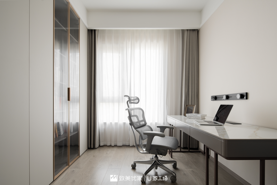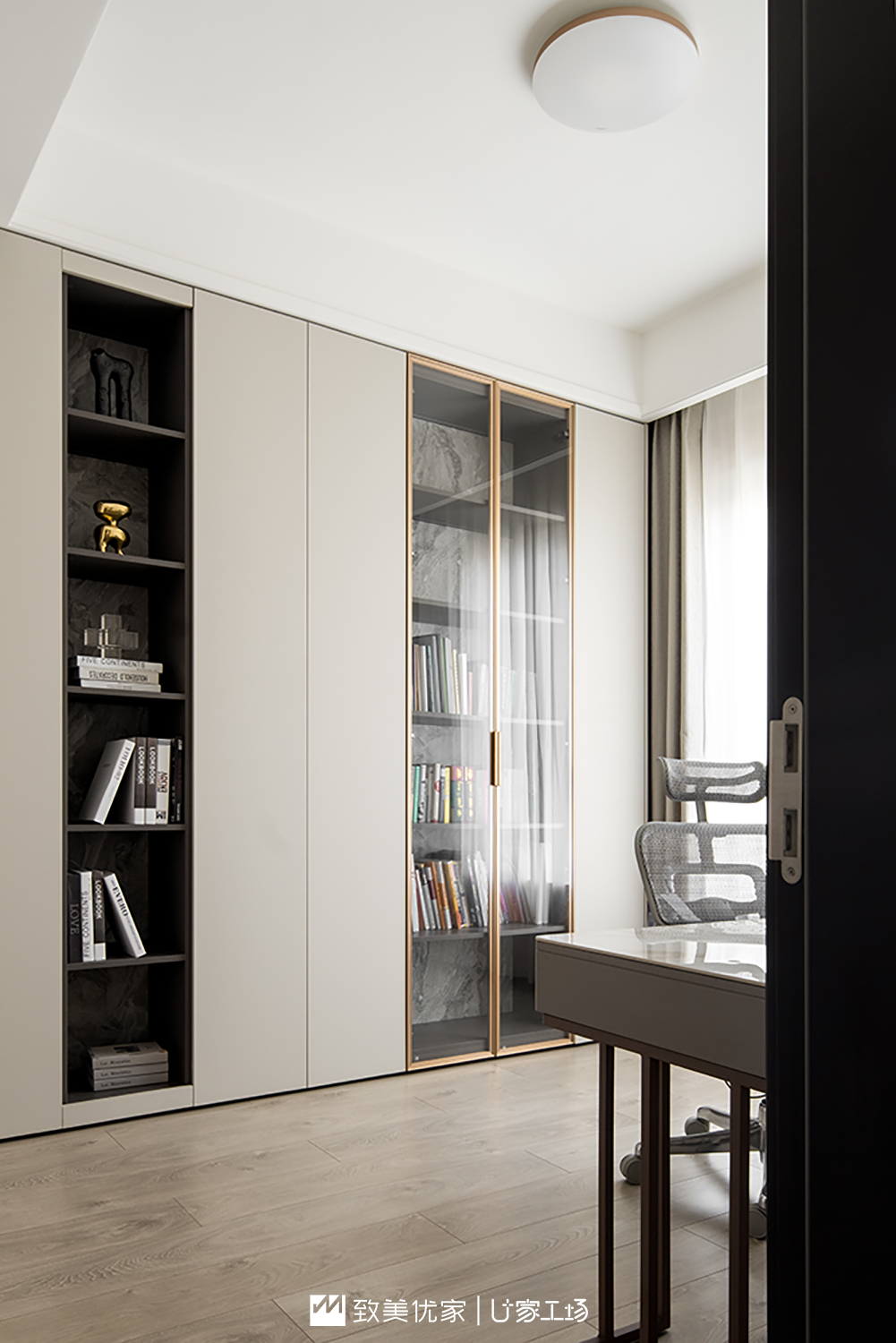 书房内还定制了到顶的书籍展示柜体,为方便男主人日常居家办公靠近办公桌的位置亦单独增加了灵活插座面板,贴心的细节设计是空间体验舒适的重要前提。