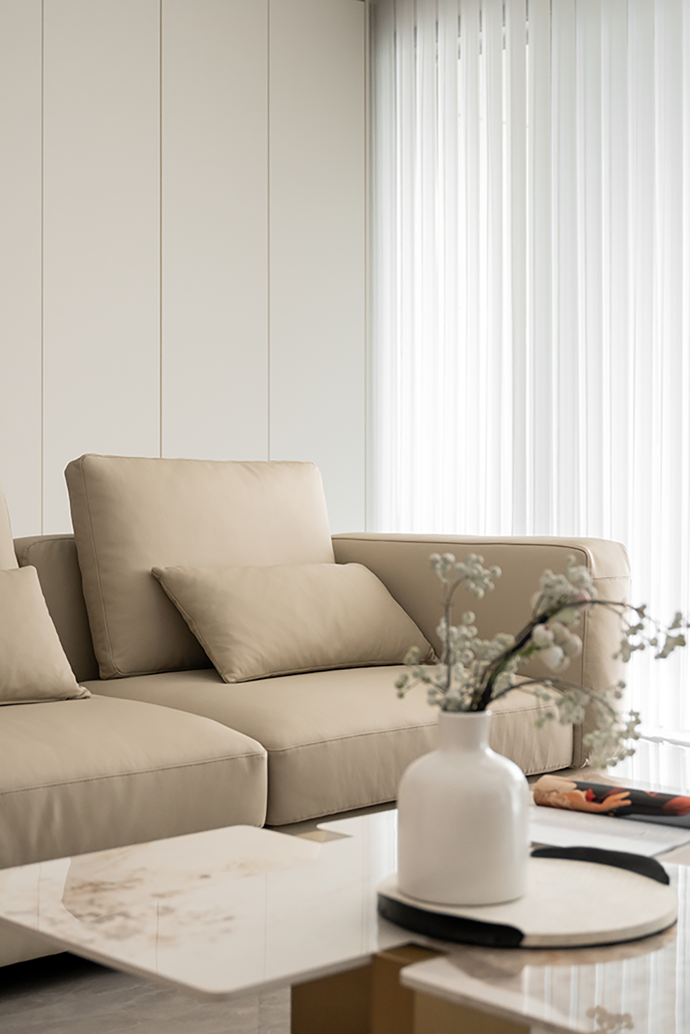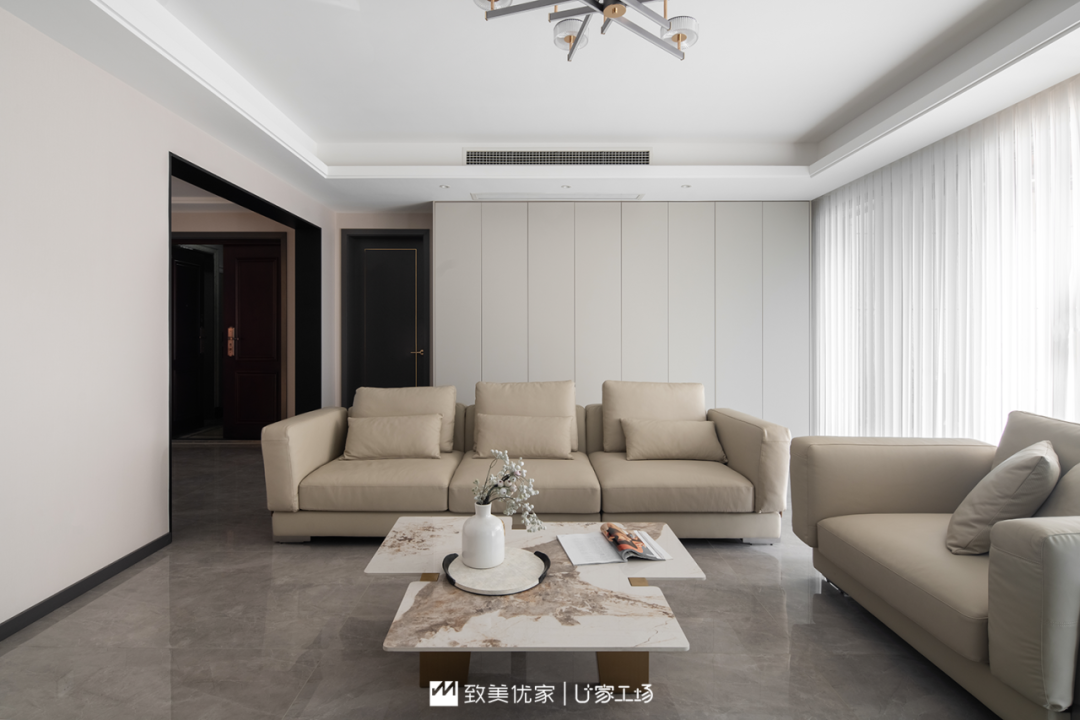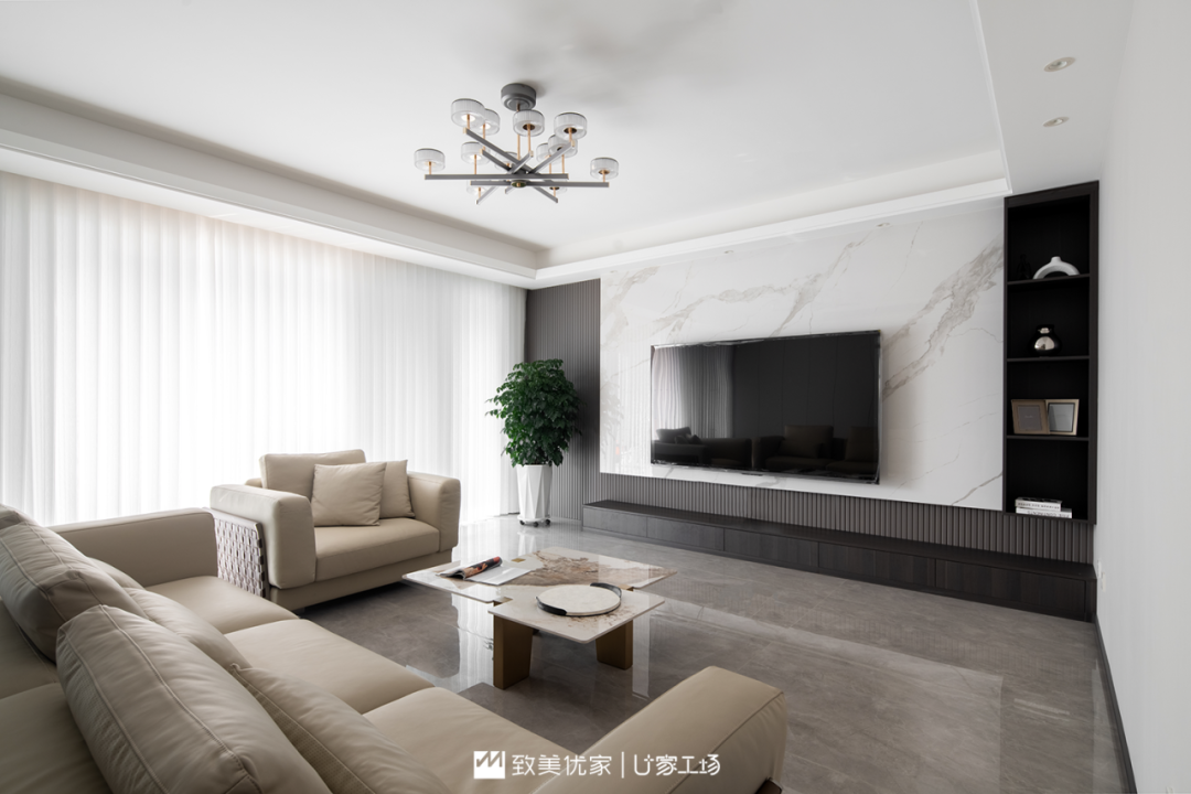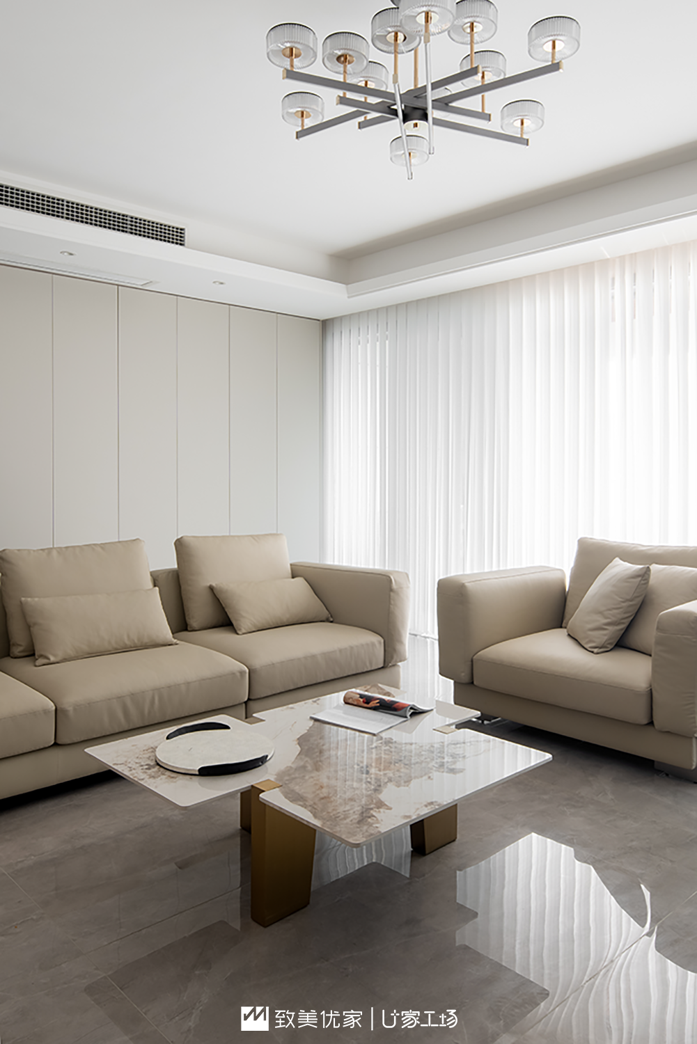 此外,为使客厅气质显得不那么“高冷”,沙发的颜色设计师搭配了柔和的卡其色,中间点缀同样奢石质感的茶几与电视背景整体便呼应的恰到好处。