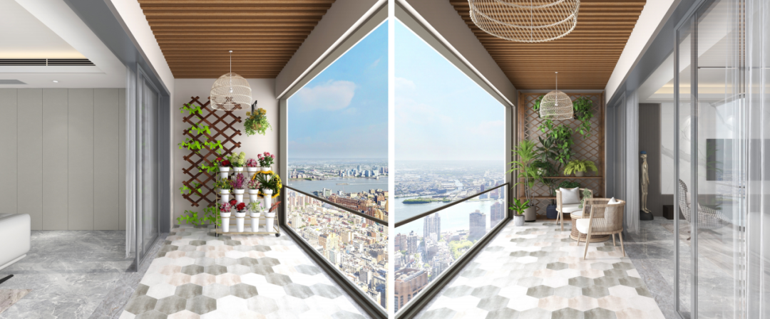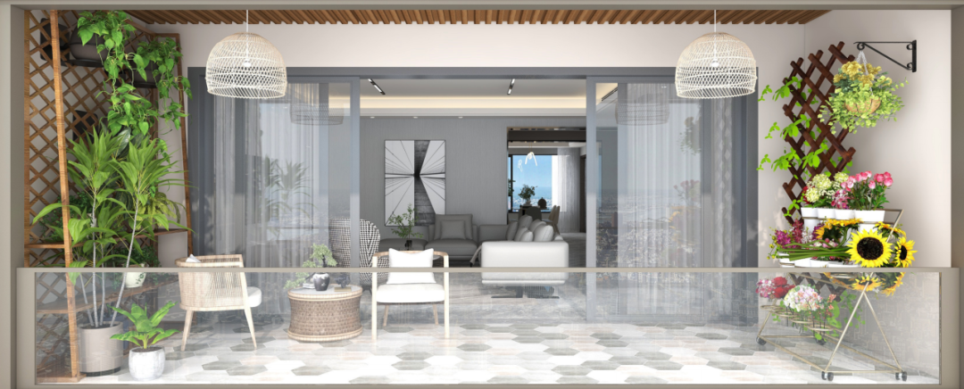 户型225㎡的套四客厅面积足够宽阔,阳台无需纳入室内,选择利用这一区域打造出室内与自然的连接地带,运用生态木和藤编、绿植等元素营造一个清新怡然的休闲区,对全家人来讲更为有益。