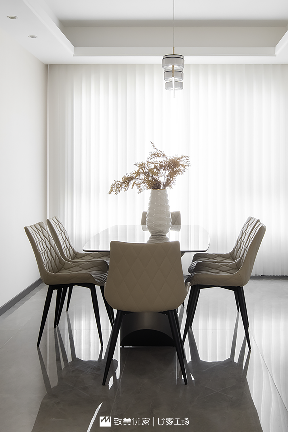 原始户型餐厅规划在入户右侧的独立区域,六人位的奢石餐桌与客厅装饰用材遥相呼应,使得公区的视觉设计更加和谐统一。