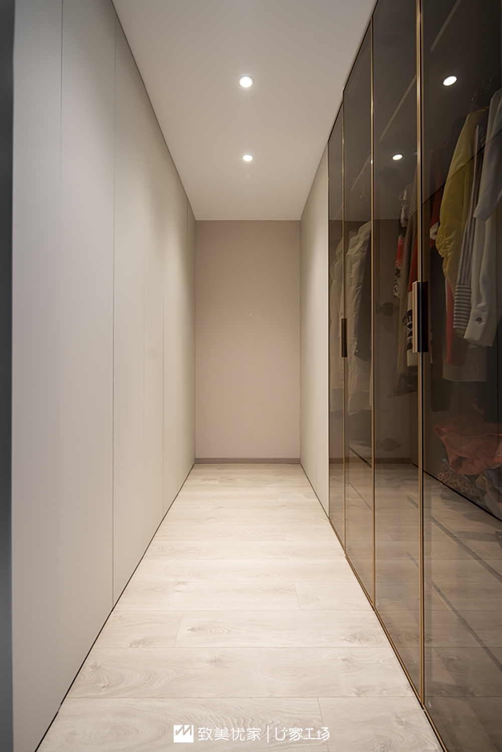 屋主对主卧的收纳空间需求较大,除了在睡眠区用背景墙板+灯带的设计营造出助眠的氛围感外,设计师还在原本衣帽间内定制了功能强大的收纳柜方便屋主有序整理生活衣物。