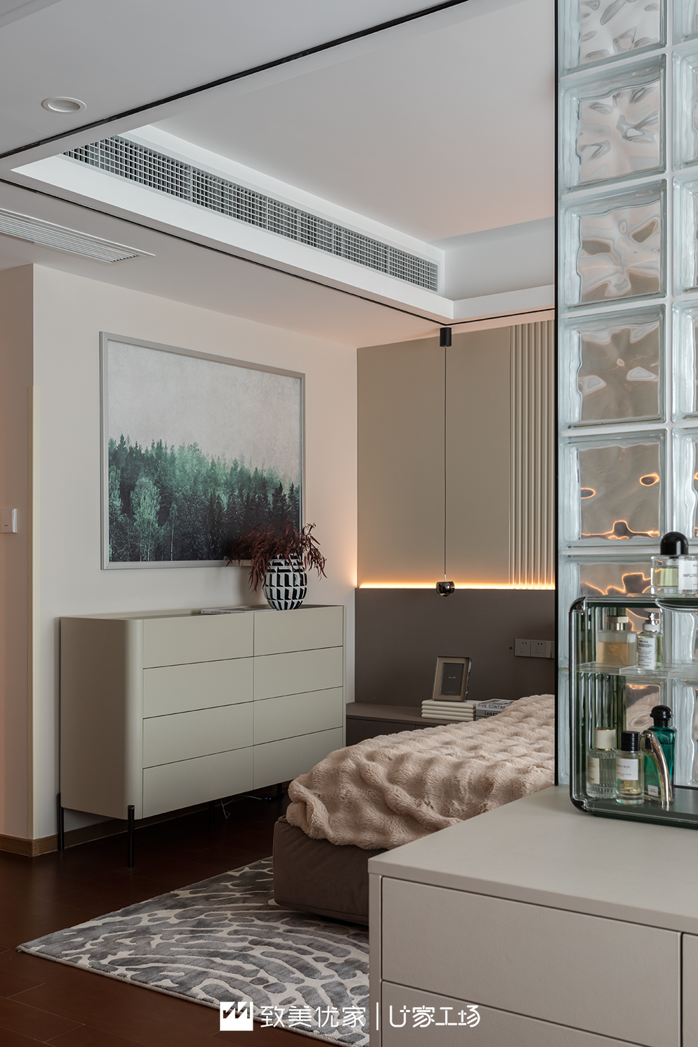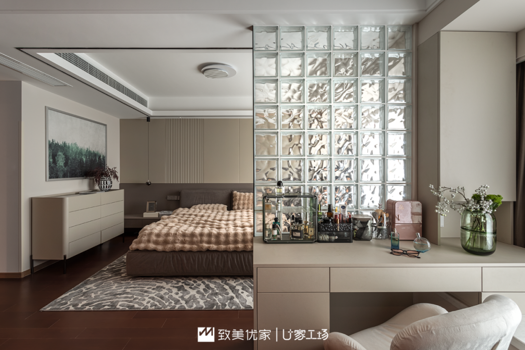 这应该是每个女生都梦想的套房,打通两个房间后,一边是主卧,一边是独立衣帽间,中间用透光不透影的玻璃砖进行隔断,让两个空间有一种隔而不断的美感和通透感。