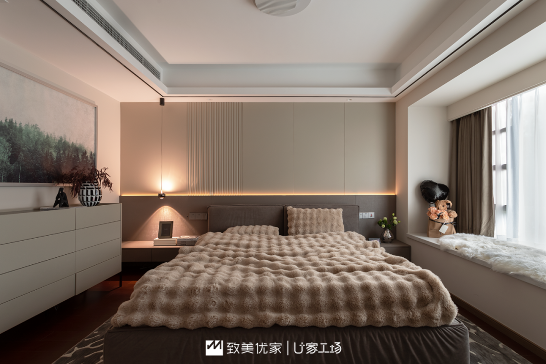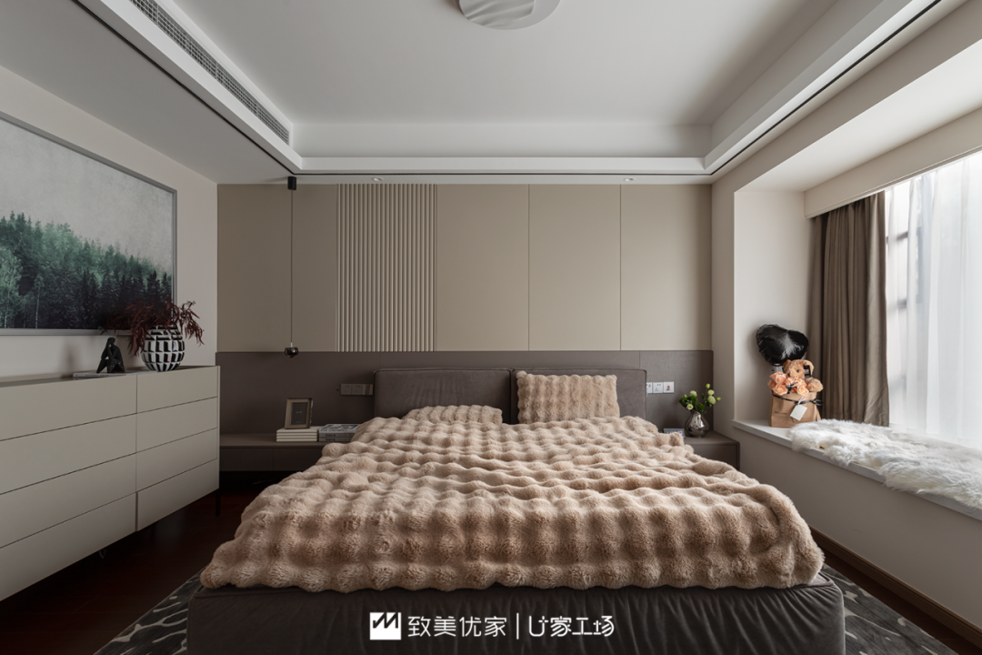 卧室空间仍然保持着意式的极简感,避免了过多的装饰和杂物,清晰的竖线条和简洁的形状使整个空间看起来更加整齐和有序。因为衣物收纳都放在衣帽间,卧室只放了一组斗柜,可以收纳小物件。