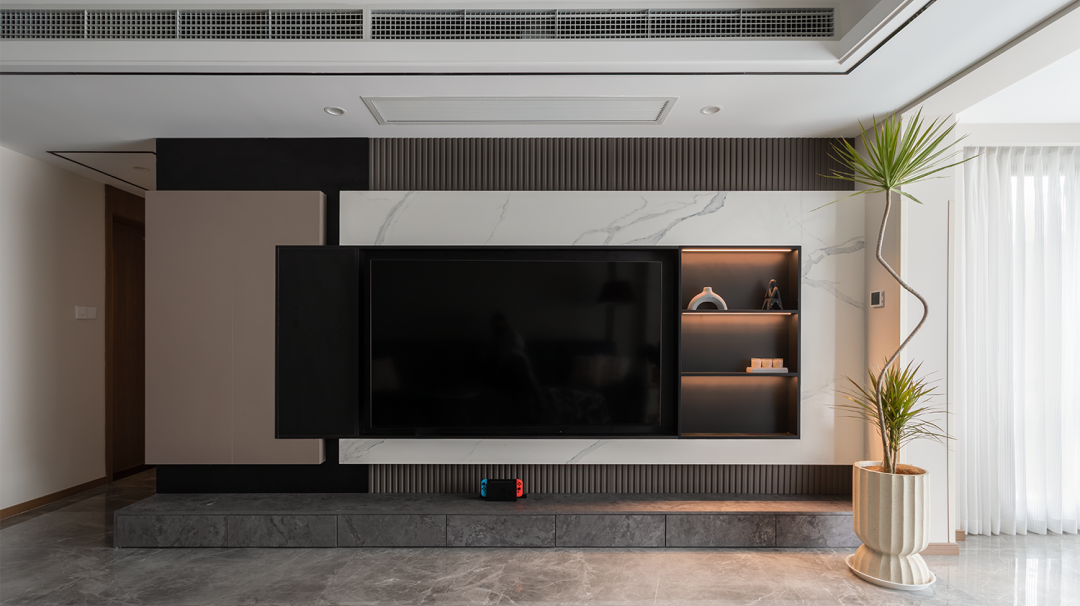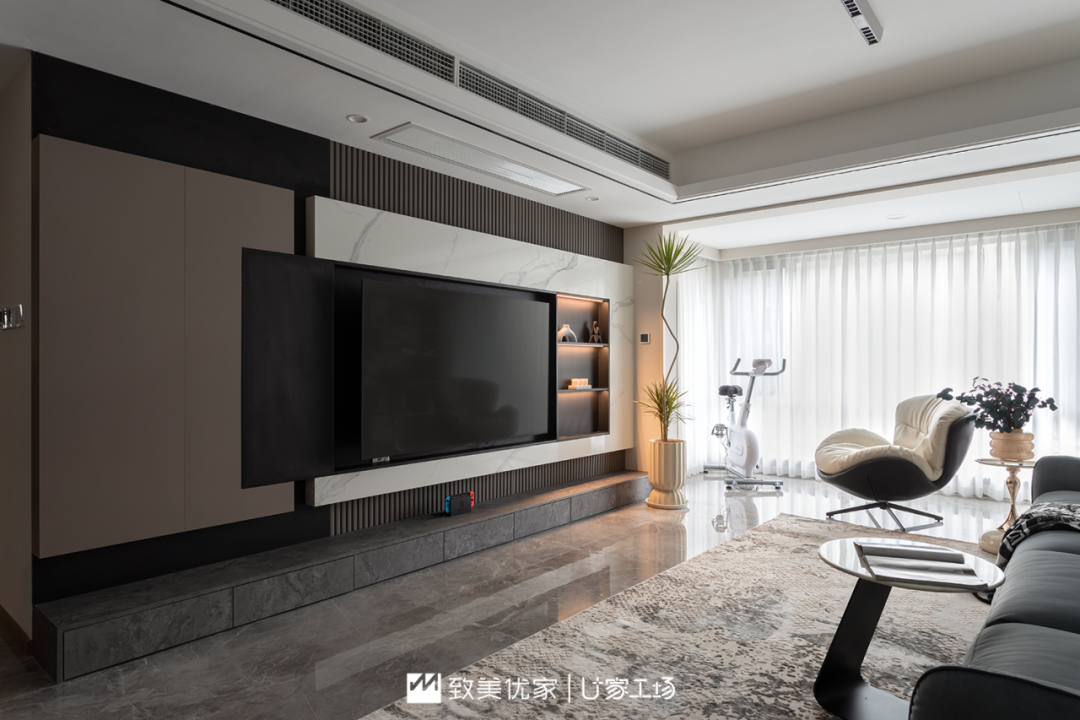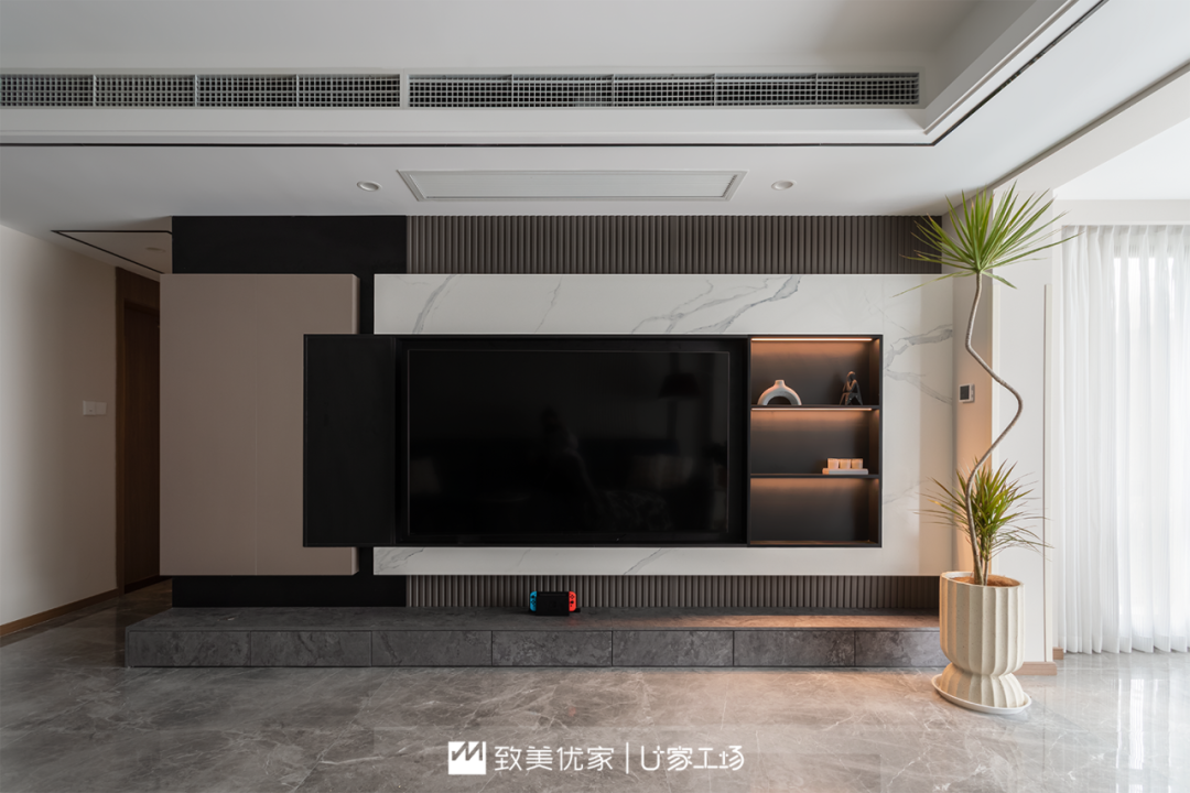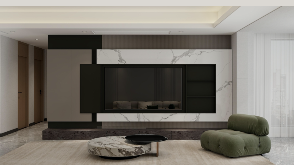 客厅是典型的意式极简风,融合了意式的优雅与简约之美,清新、舒适。整个客厅的布局注重简洁和流畅性,强调空间的整洁和无冗余的设计。电视墙用了格栅和岩板进行结合,直线条的横纵穿插稳重而不失灵动,落地电视柜既美观又好打扫。