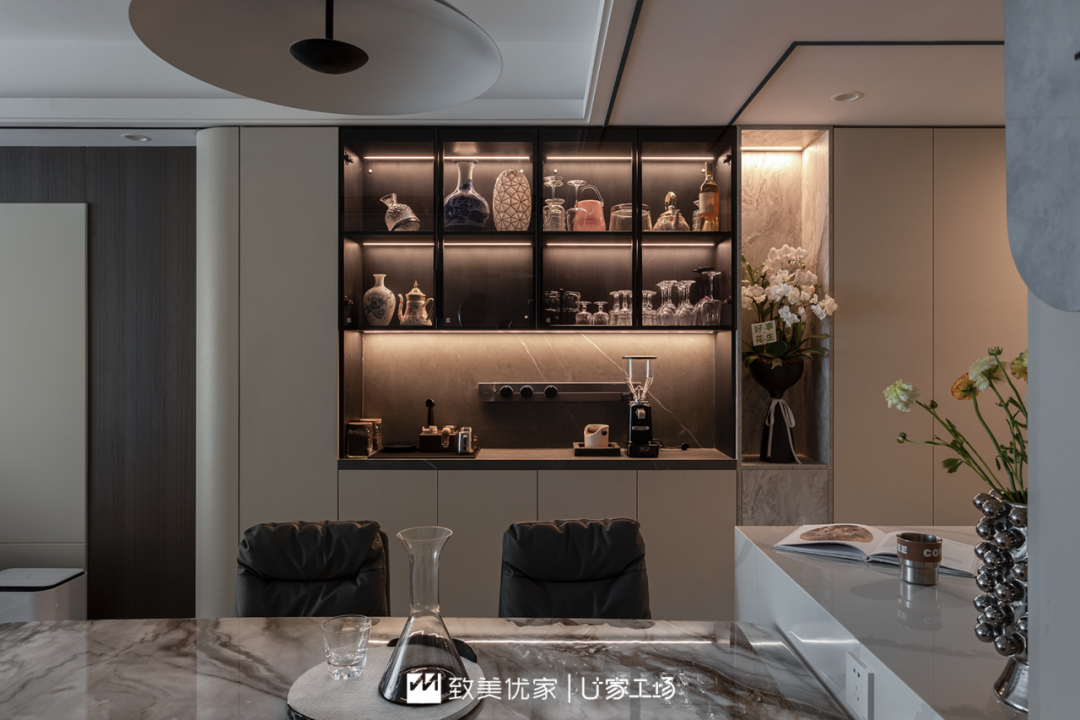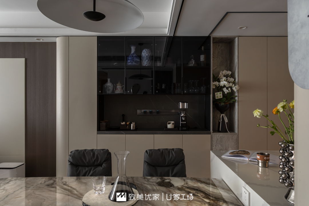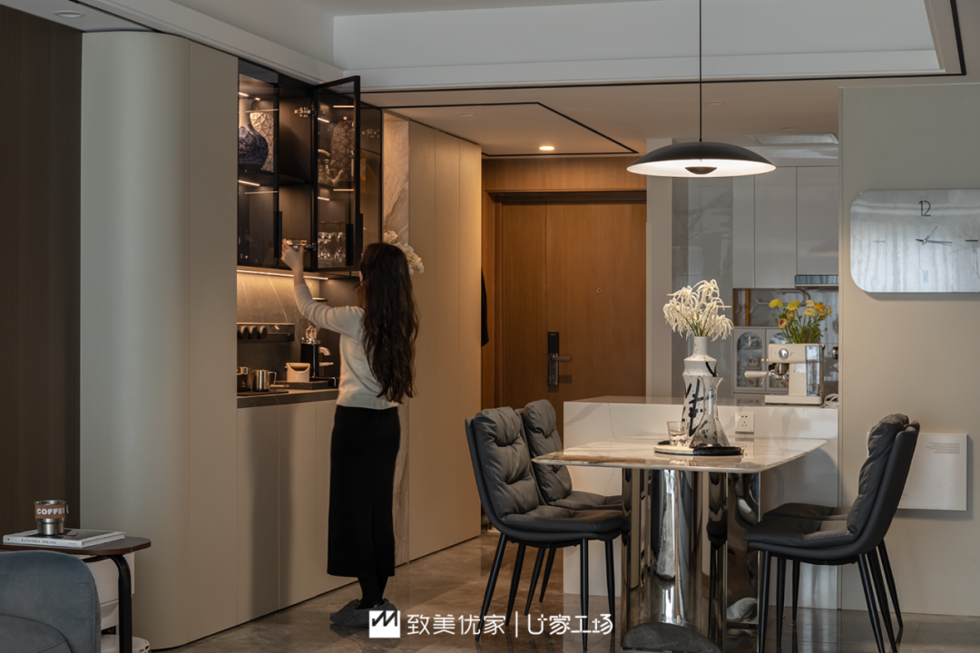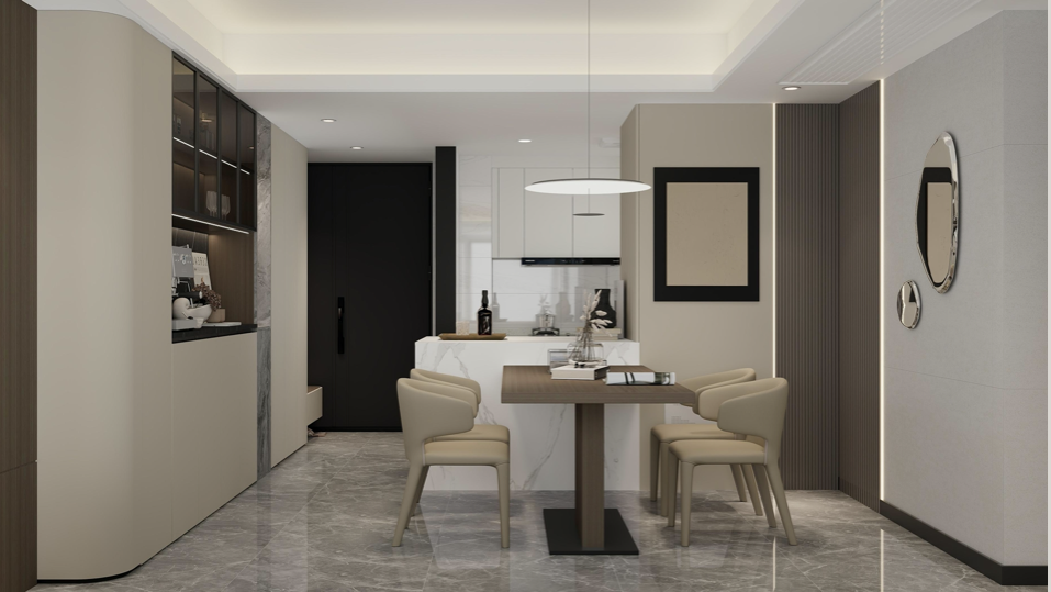 中间用端景过度到餐边柜,可收纳可展示,黑色的玻璃展示柜和收纳柜让整个入户及餐厅空间都整洁有序,两边倒弧的柜体设计给人一种圆润舒适的安全感。
