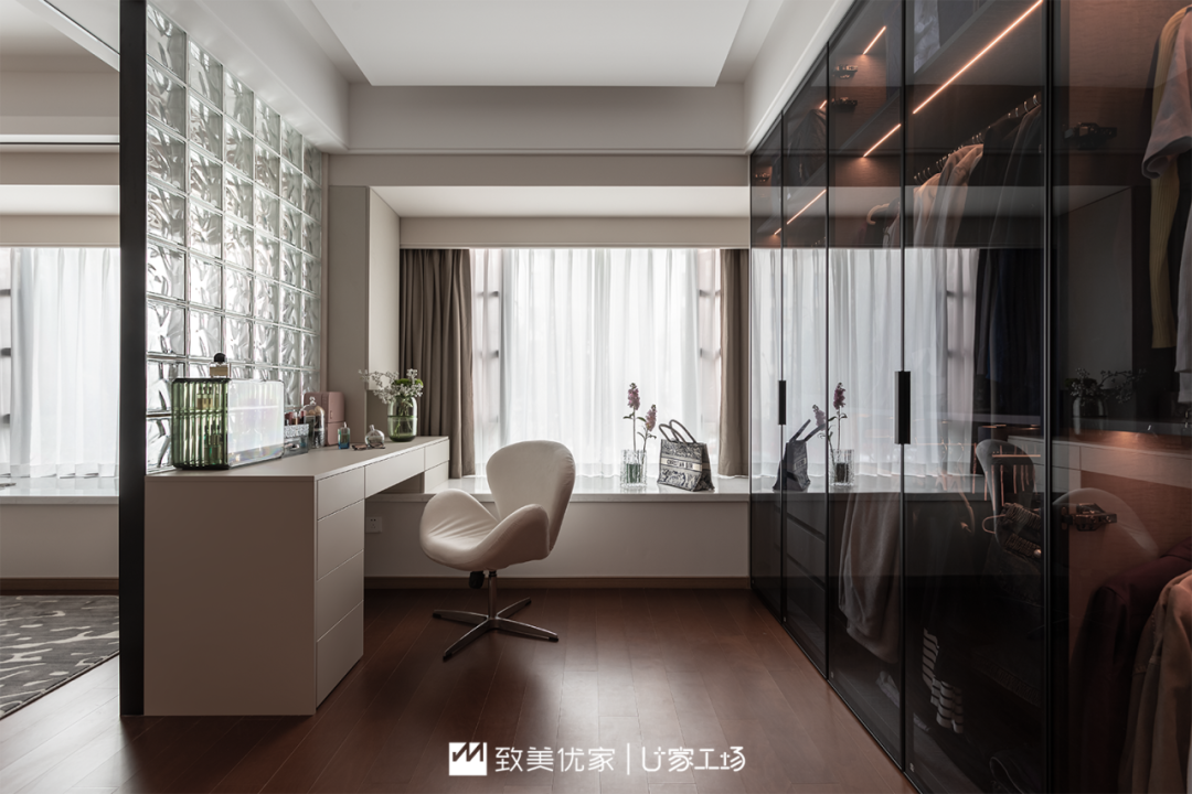 玻璃隔断处正好做成了梳妆台,借用一部分飘窗的位置让空间利用率更高,设计师还巧妙的利用了飘窗上方的位置做了一组化妆品收纳柜体,处处都是细节和小心思。
