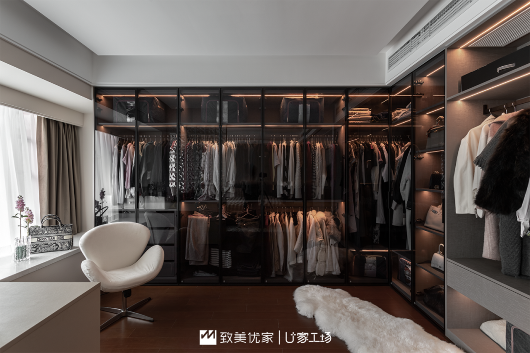 移步衣帽间,你会惊叹于“这不就是自己的梦中衣帽间吗?”全玻璃开放式衣帽间、全挂衣式设计,这样既保持了超高的颜值,也不会显得凌乱,整个柜体在转角处只保留了非常小一部分的叠放区,并且考虑了次净衣的存放之处,真的是非常懂生活才能设计得如此贴心。我相信每一个看了这个衣帽间的女生,都无法拒绝它,简直太爱了!
