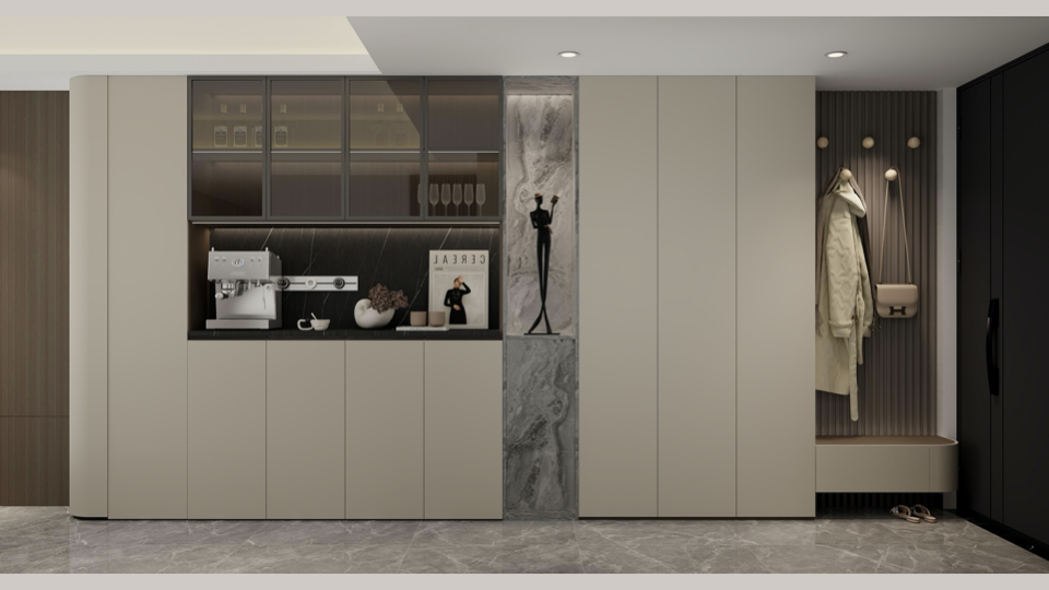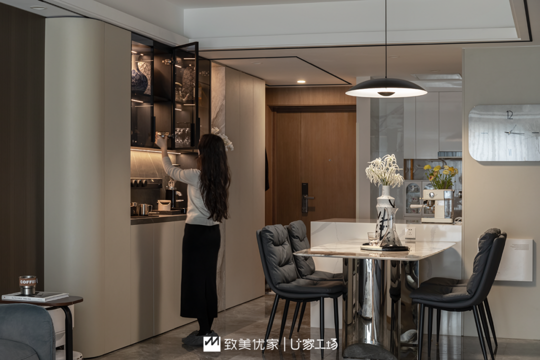 ❶ 入户定制整面墙鞋柜+餐边柜,倒弧设计更舒适,收纳翻倍整体性更强。