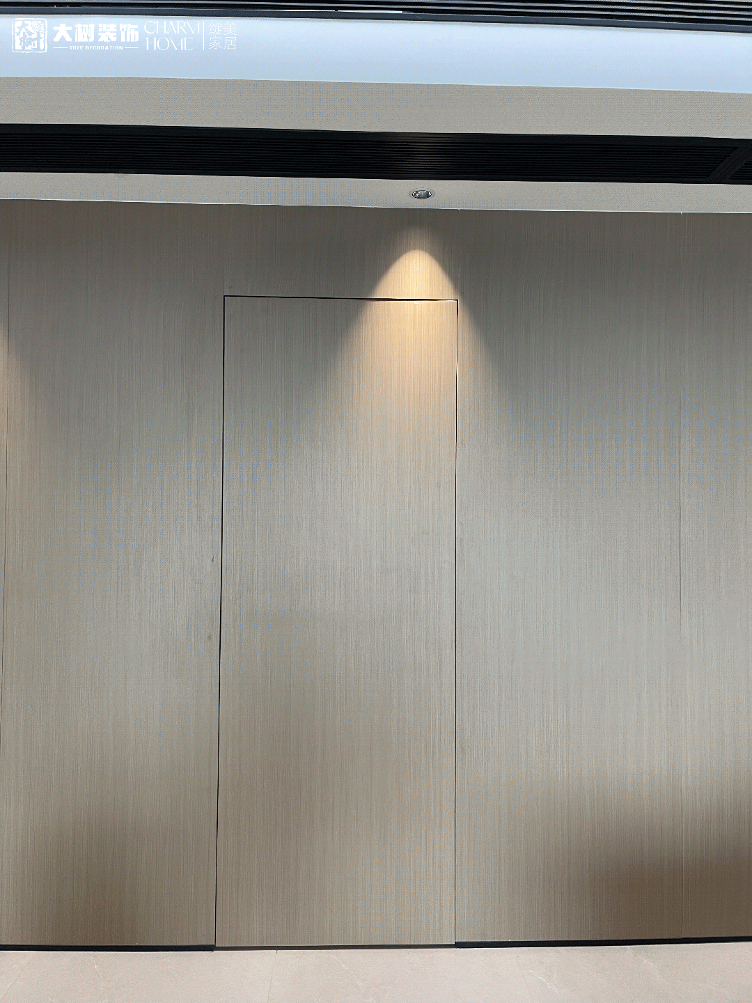 护墙板+隐形门,统一材质的延续,让餐厅和客厅相连。无主灯设计、没有奢侈材质装饰的墙面,也独有自己的造型与设计感。