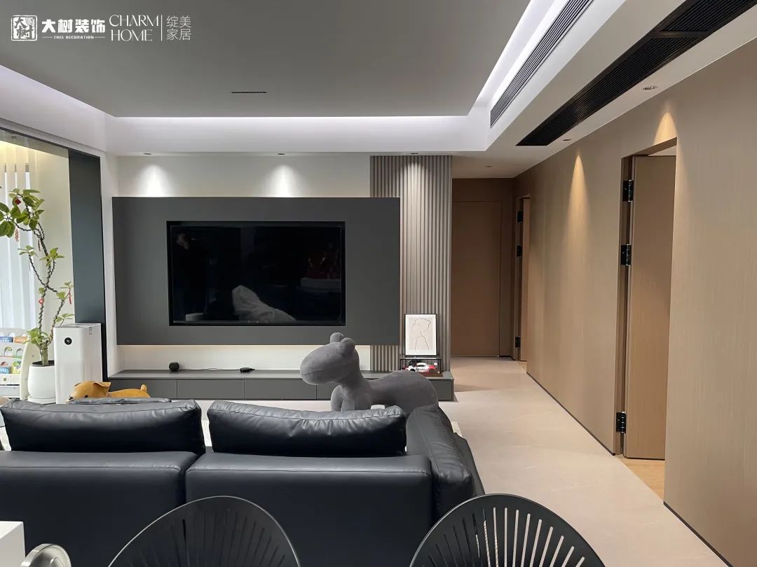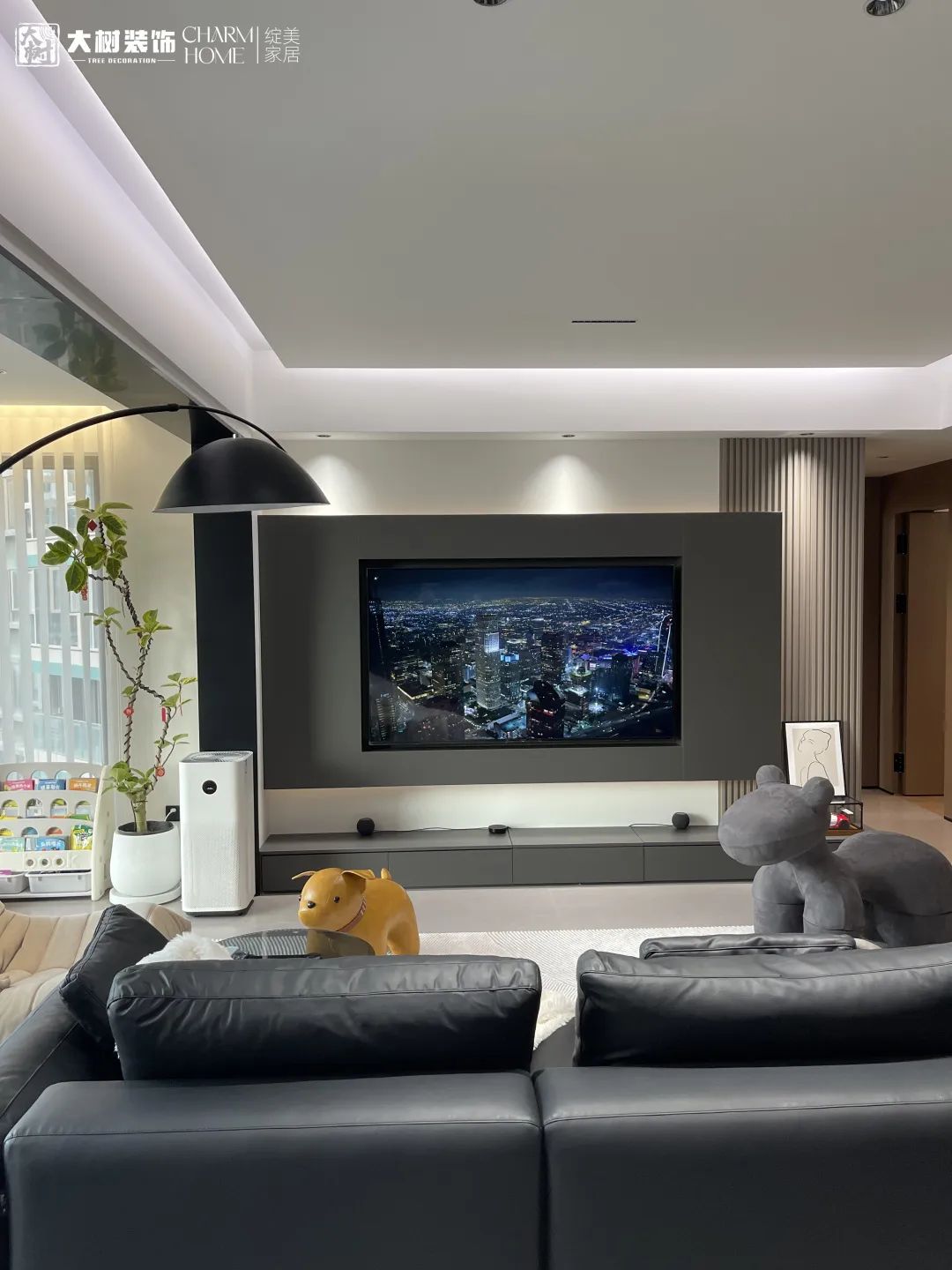 黑白灰给客餐厅整体氛围定下基调,极简风格,高级有秩序;简单,但细看又有乾坤;电视内嵌至背景墙之中,从白到灰,沉静而深邃,无彩色的装饰下,是悄然存在背景色。