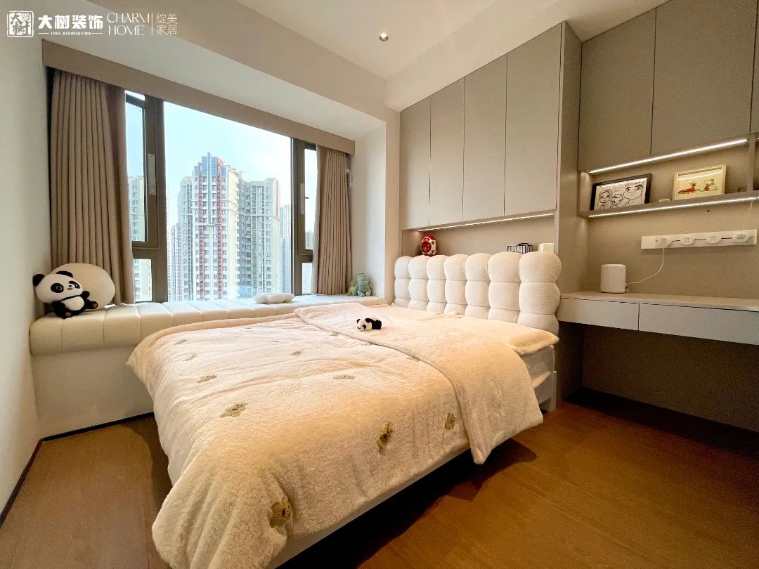 次卧设计理念和主卧类似,色系选择对立的白色打造整个空间,大力度的增大收纳空间,柜子上墙到顶,转角处设计悬浮桌面,兼并美观与实用性!