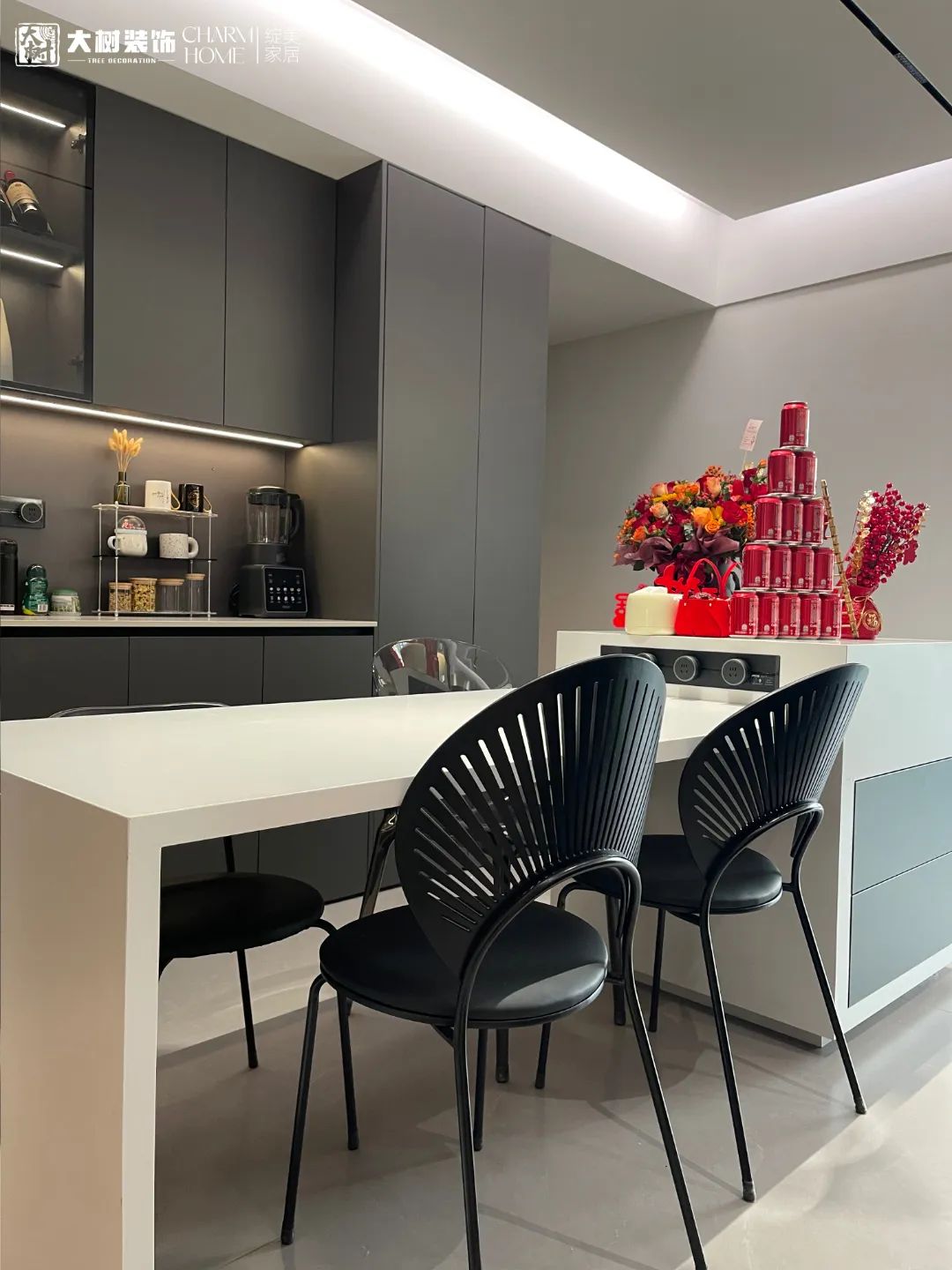餐厅延续整屋的配色,选择素色系列的黑白灰保持着家的平静。