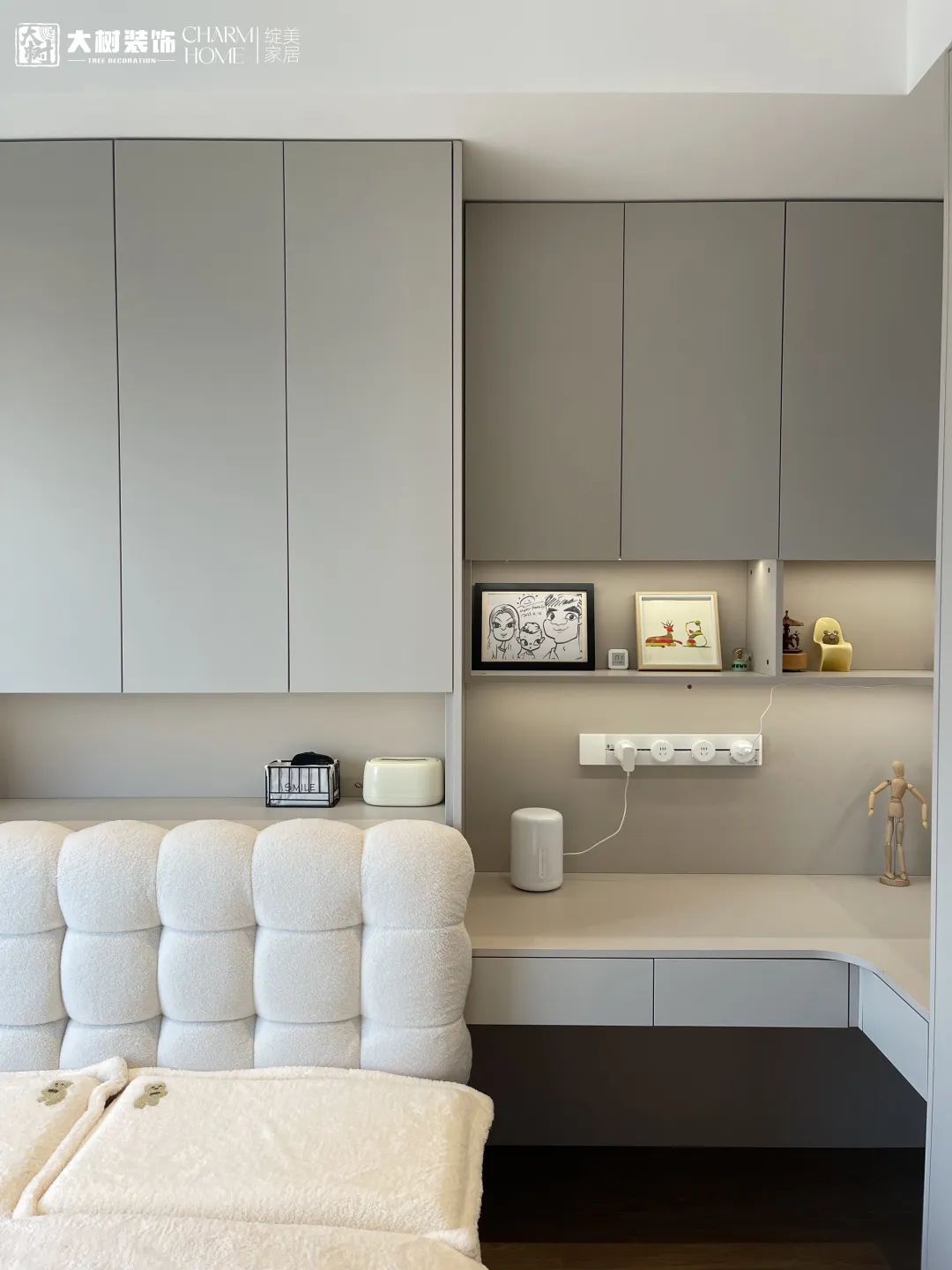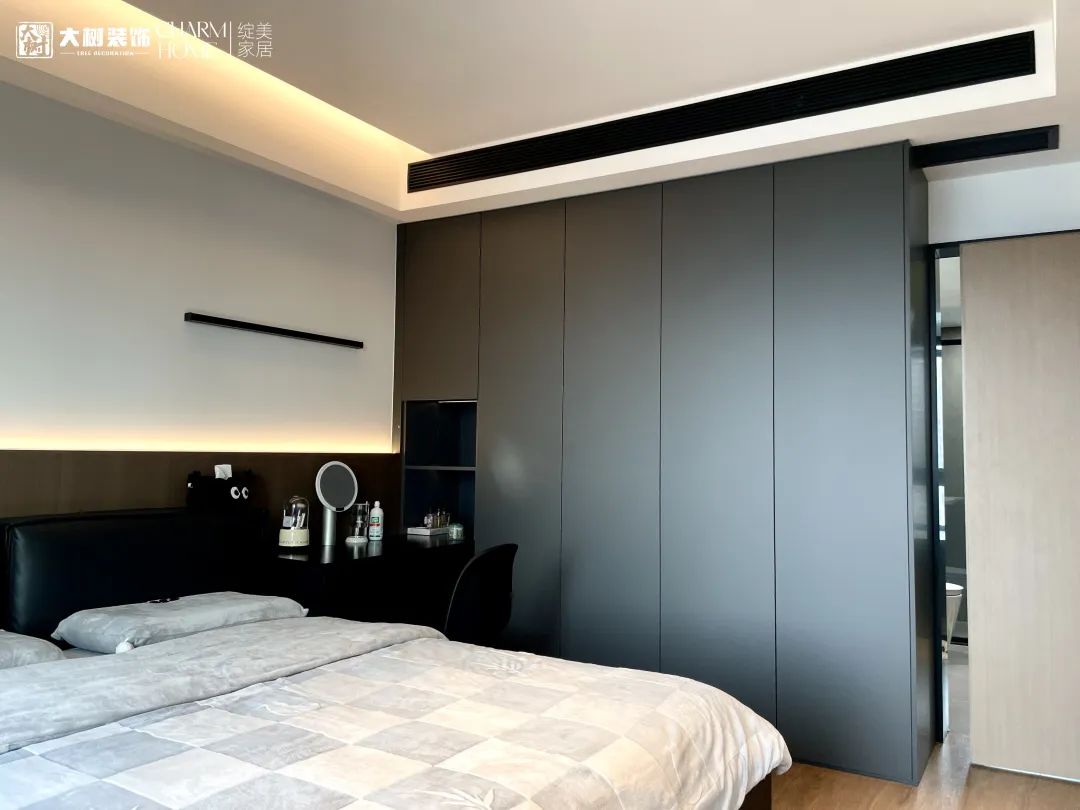卧室一柜到顶的衣物收纳区,从柜体墙面延伸出来的悬浮桌面,设计梳妆台,黑白灰为主调的卧室,更显质感!