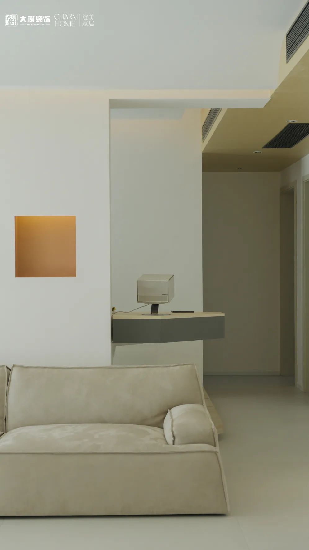 摒弃了传统的电视墙,与沙发位置做了对调。把我们的电视改为投影,利用顶部棚面将其内嵌包裹,让空间拥有更多的可能性。