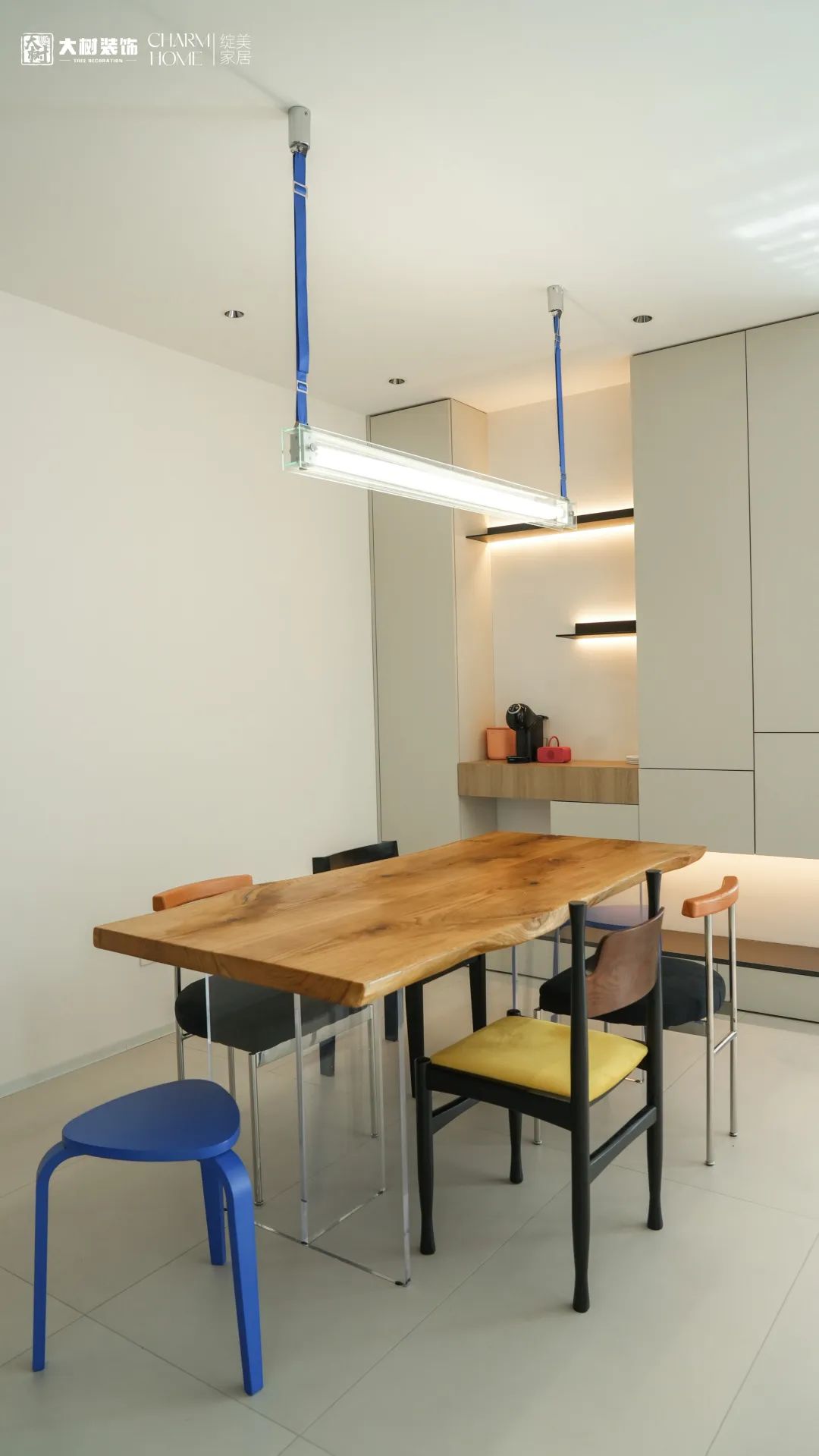 以素净优雅的色彩为空间基调,选择繁复、多彩的餐桌作为陈设,作为色彩点缀。