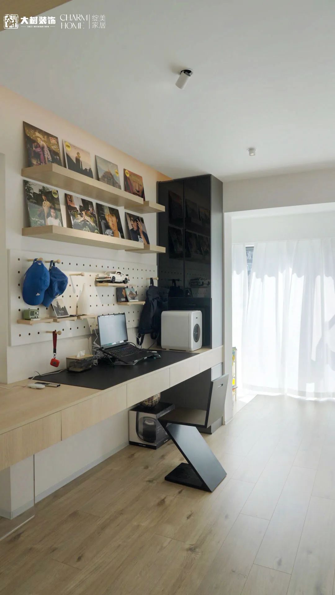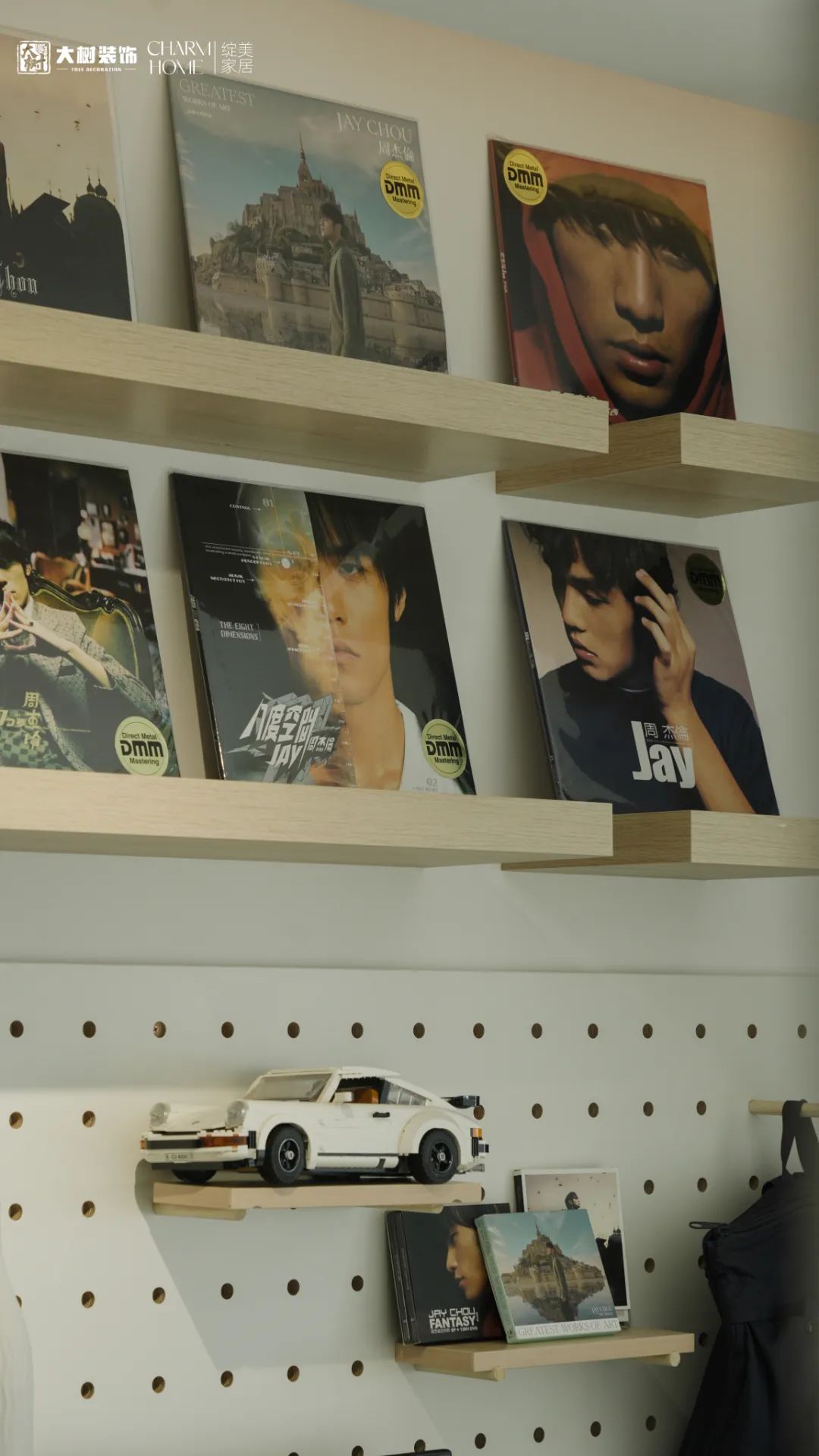 隔板+洞洞板是书房的最佳搭档,将业主的兴趣爱好完美的展现其中,可以看出业主是个不择不扣的“Jay迷”~